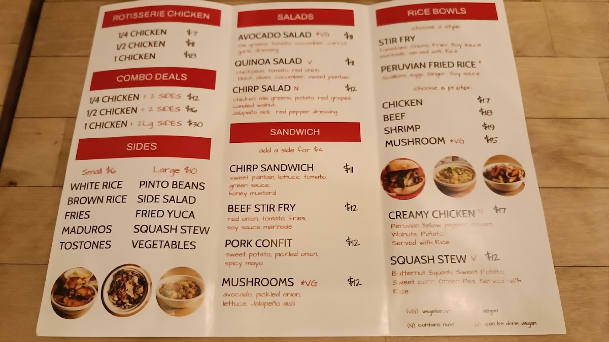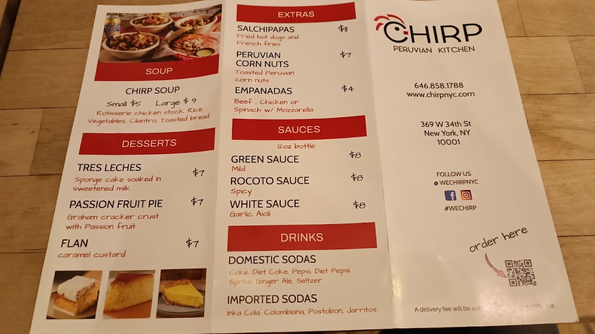 Welcome to Chirp, a delightful Peruvian restaurant nestled at 369 W 34th St., New York, NY. With a menu that bursts with flavor, Chirp offers a variety of dishes that epitomize the essence of Peruvian cuisine. Every bite tells a story, from the savory empanadas—choose from Spinach and Cheese or hearty Beef and Chicken, each priced at just US$5.50, to the mouthwatering pork confit sandwich enhanced by spicy mayo and pickled onions, all for US$14.00.